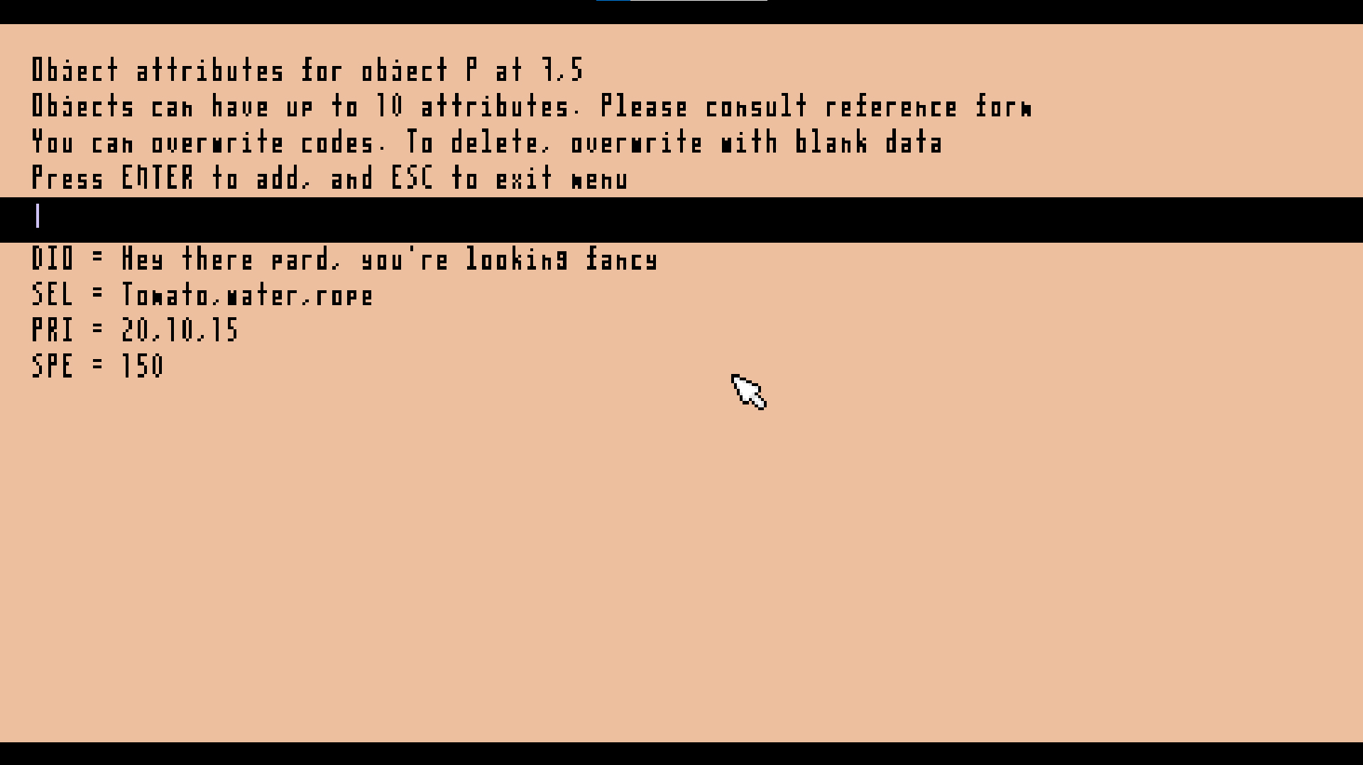 Double right-click an object to open its attribute menu. Attributes are three letter codes and can contain numbers or strings of text, and unique to that one specific instance of the object. Each object can have up to ten attributes. Again, what they represent will be outlined at the same point everything else is.