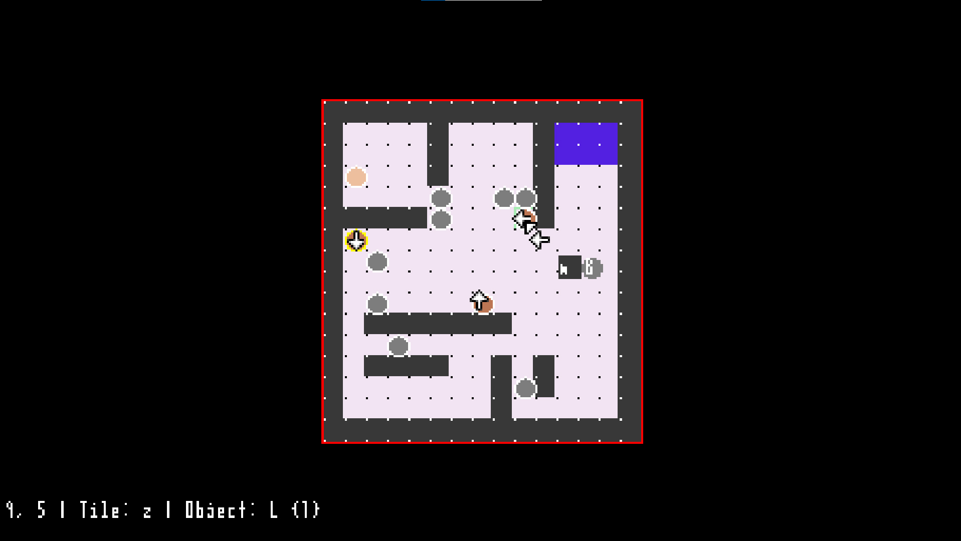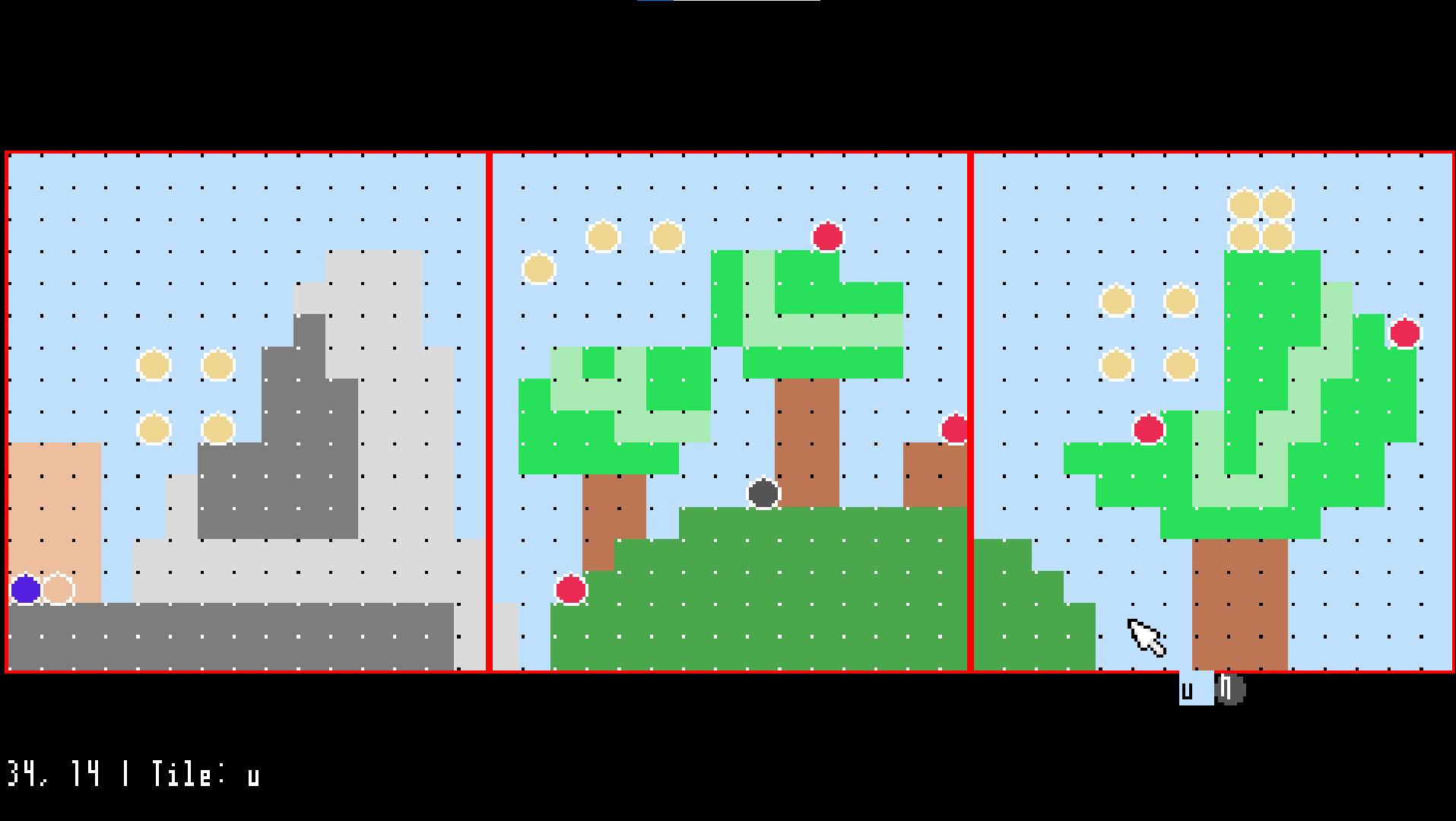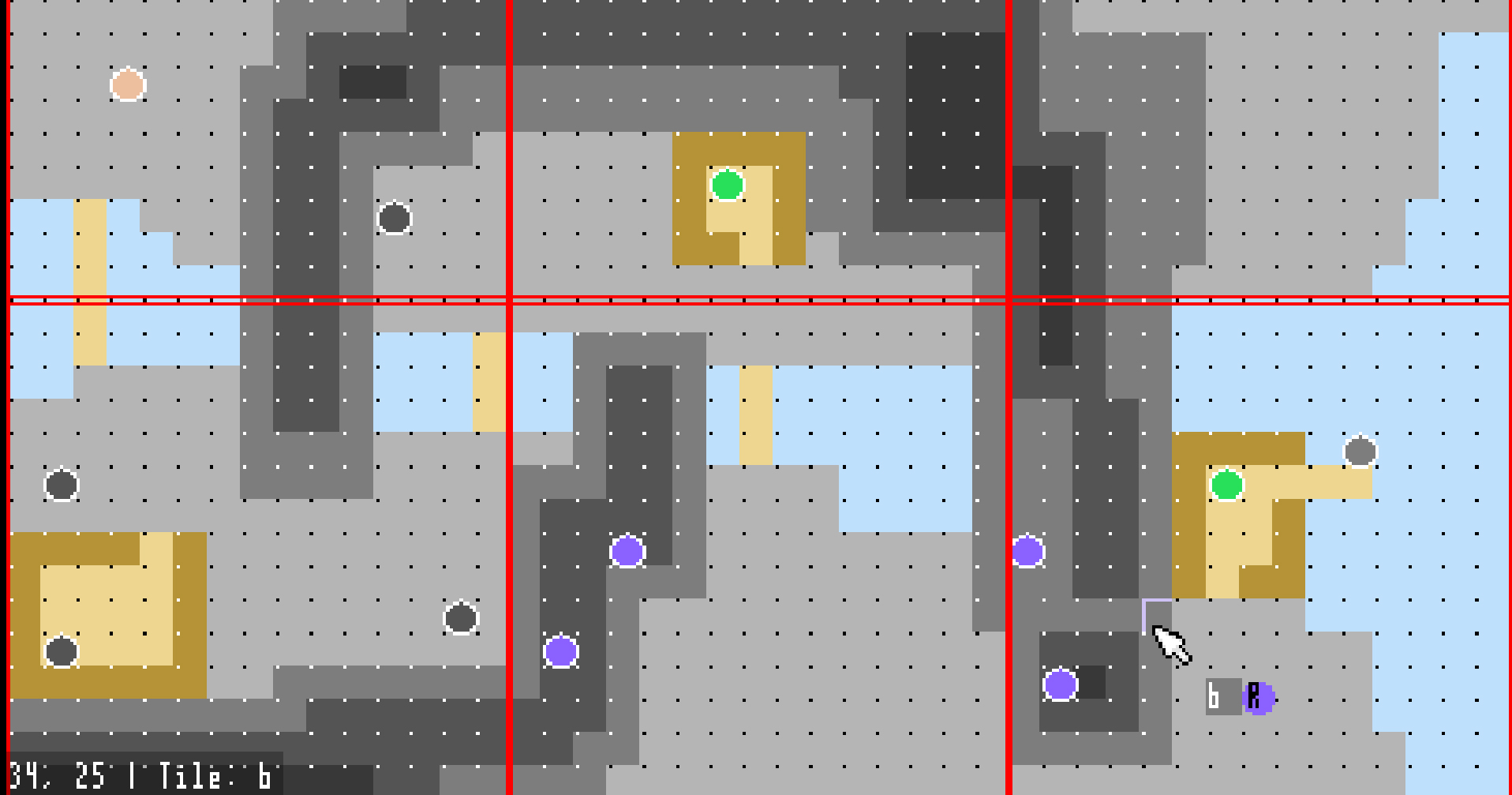Open the program, behold a dot grid and a larger red grid. The dot grid represents squares in a game, and the red grid represents the size of the player’s screen. You can paint tiles onto this grid with the left mouse button. Select a different tile with a letter key. (There are 26 tiles.) What these tiles represent will be outlined near the beginning of each project.